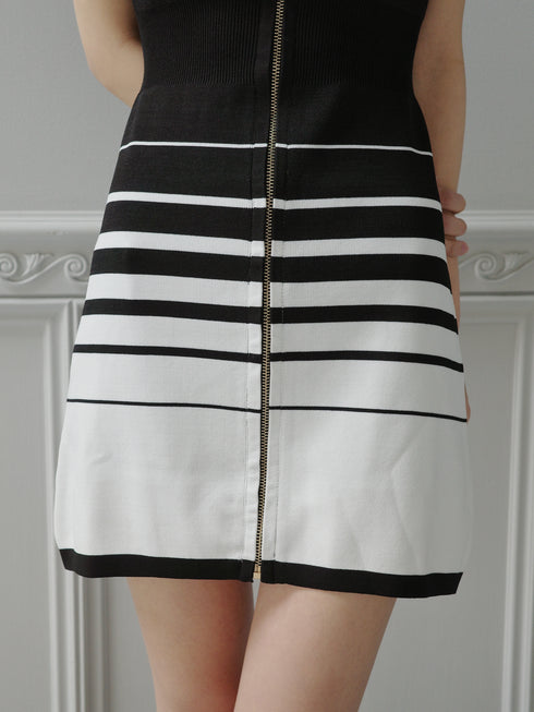 上身頃はシンプルなブラックで引き締めつつ、スカート部分にはホワイトをベースにグラデーション調のボーダーラインが入っており、視覚的に脚を長く見せてくれる効果も。